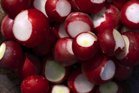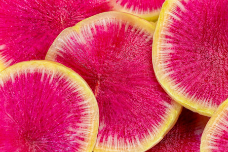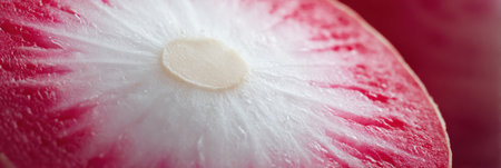 A cross-section of a radish displays its colors and textures. The vegetables center and outer layers are visible.