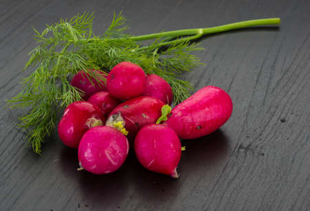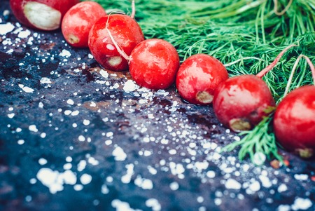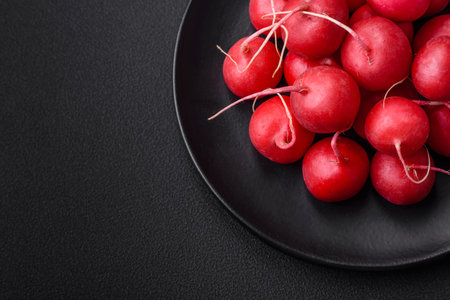 Delicious fresh raw red radish for making healthy salad on dark concrete background
