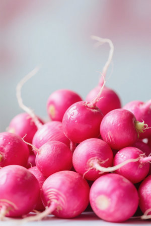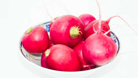 Red salad radish on light background. Red organic radish with a bunch of green tail, copy space. Why to eat radish.