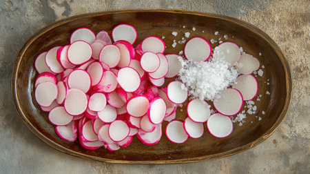 Thinly sliced radish chips with sea salt on tray, minimal styling and space