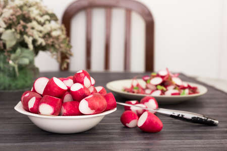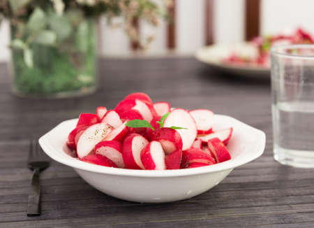 Radish cut into thin slices for salad on a white plate. Isolates.