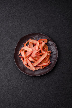 Early sliced red radish and ginger pickled in ginger sauce. Fermented foods. Kimchi is a traditional Korean dish, Asian cuisine. Probiotics.