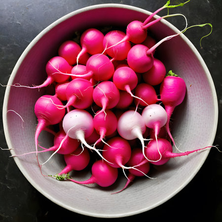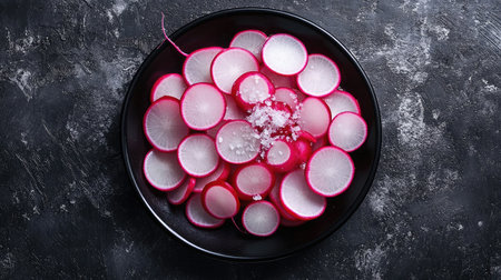 Floral arrangement of radish slices on marble background, culinary art. generated by ai