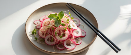 AI Generated. Traditional Pickled Radish Dish Neatly Arranged with Fresh Herbs and Chopsticks