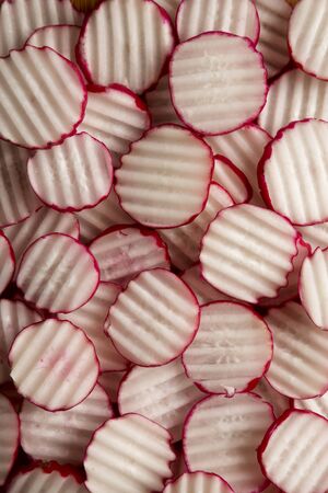 Fresh Radish Chips Slices, top view. Flat lay, overhead, from above.