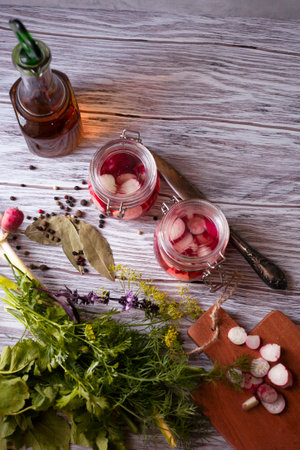 Two Glass Jars with Pickled Radish with greenery, vinegar garlic and spices on white wooden table , still life, selective focus