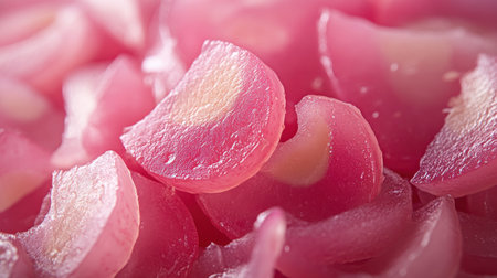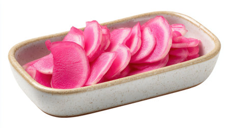 Bright pink pickled ginger slices arranged in white ceramic dish isolated on clean background, traditional Japanese sushi condiment and palate cleanser.