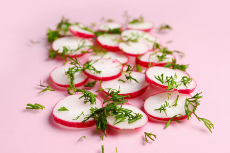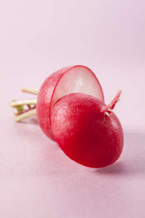 Fresh sliced organic radish vegetable on a grey concrete broard
