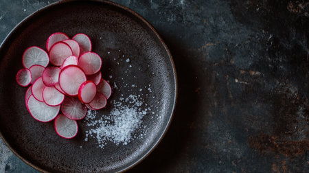A plate of freshly sliced radishes arranged in a circular pattern, with a sprinkle of sea salt.
