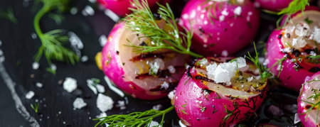 Grilled radishes with charred edges, floating with a lemon vinaigrette drizzle, garnished with fresh dill and sea salt.ai generated