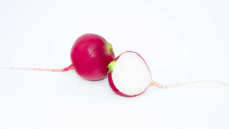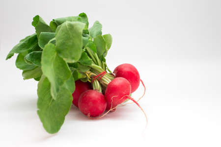 Row of fresh organic red radishes with tops on white wooden background. Top view. Vegetable background