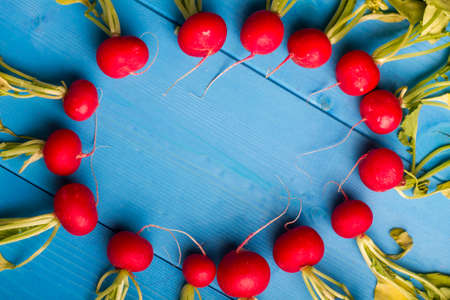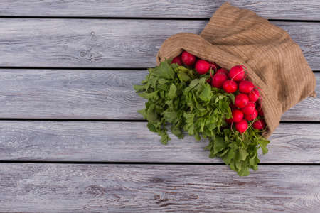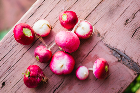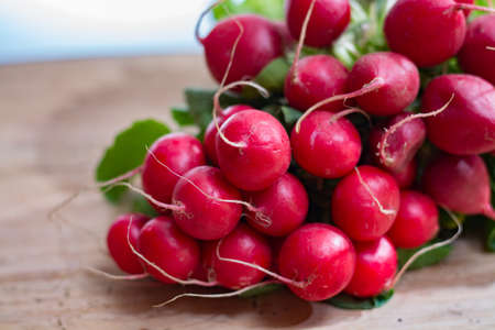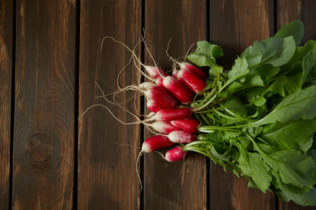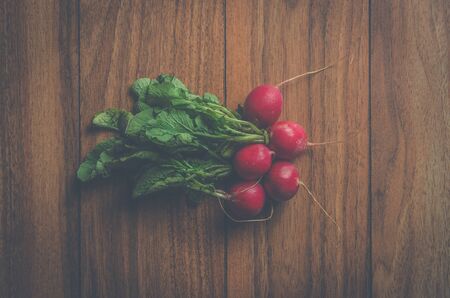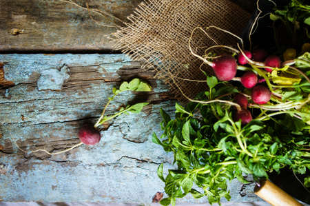 Bunch of fresh radishes vegetable harvest on wooden rustic background.