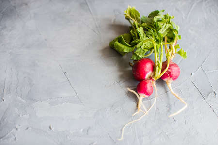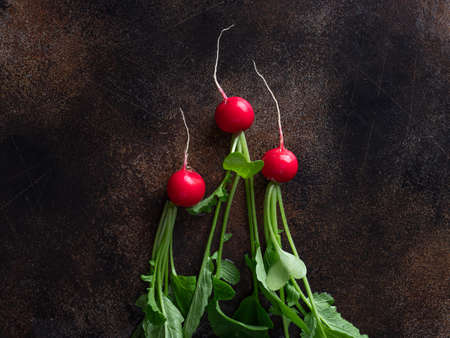 Delicious fresh raw red radish for making healthy salad on dark concrete background