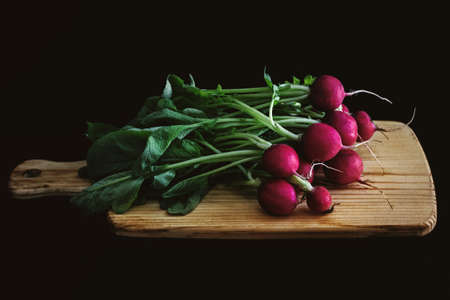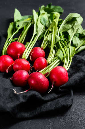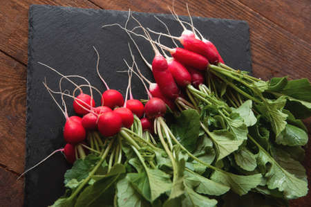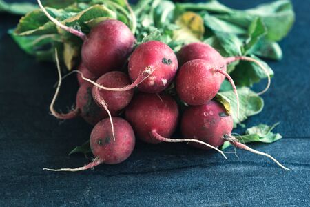 Fresh red radish on a dark table. Growing organic vegetables. A bunch of raw fresh radishes on a dark background ready to eat. Raw food. food photography - Image