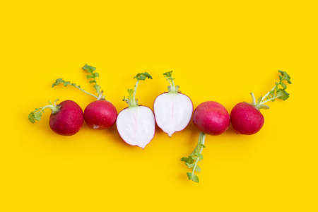 Vibrant fresh radishes with leafy greens create a striking contrast against a bright yellow background, perfect for food photography or healthy eating themes.