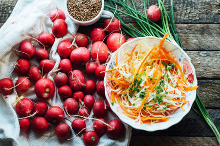 Fresh ingredients for healthy salad – organic red radish and green lettuce