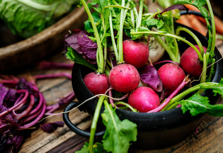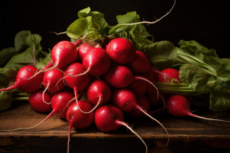 Bundle of fresh radishes with lush green leaves, natural beauty of organic produce, healthy eating and cooking at home.