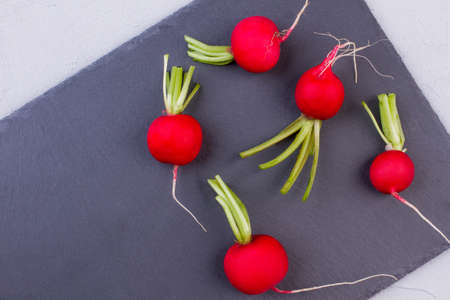 Five radishes on slate, top view. Red organic radishes with a bunch of green tail, copy space.