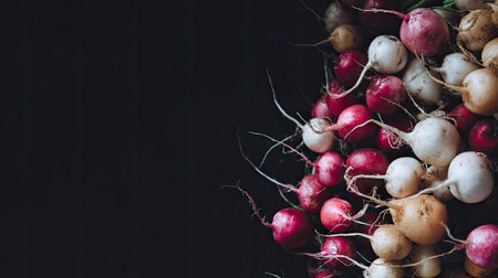 An overhead shot showcases a pile of fresh radishes, exhibiting varying shades of red, white, and tan. The composition emphasizes texture and natural shapes against a stark black backdrop. This image could be suitable for commercial uses within the food or health industries, offering copy space.
