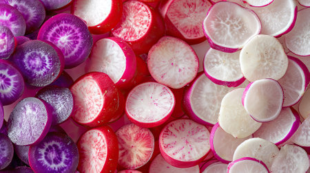 AI Generated. Freshly Sliced Radishes on White Surface with Sea Salt Sprinkles