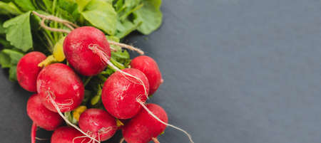 Bunch of fresh dirty organic ripe red radish with green leaves on black background. Vegetarian, vegan, raw food. Close-up, banner with copy space