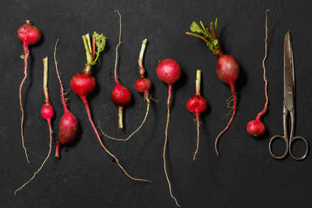 red radishes on a black background, with cut tops and vintage scissors. Top view, horizontal