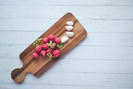 The afternoon sun shines on the wooden plate, complete and sliced red radish