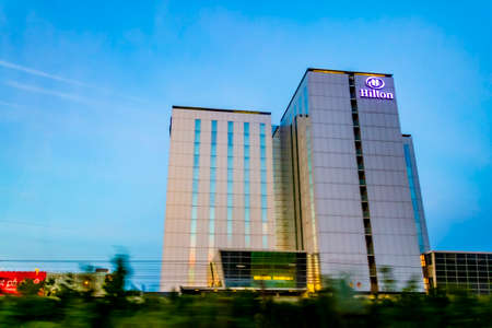 Driving by the Hilton Hotel in sunrise somewhere in Denmark.