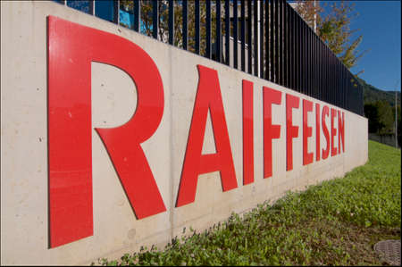 Cadro, Ticino, Switzerland - 7th October 2019 : Logo of the Swiss Raiffeisen bank hanging in front of the entrance. Raiffeisen is a Swiss cooperative bank, the third largest bank in Switzerland.