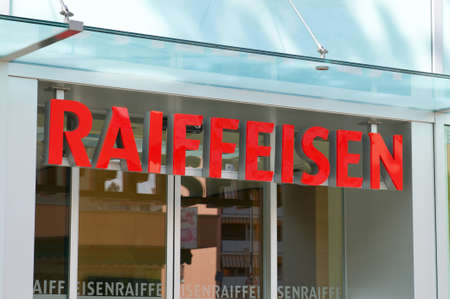 Savosa, Ticino, Switzerland - 25th April 2021 : Raiffeisen Bank sign hanging at the building entrance in Savosa. Raiffeisen is a Swiss cooperative bank, the third largest bank in Switzerland