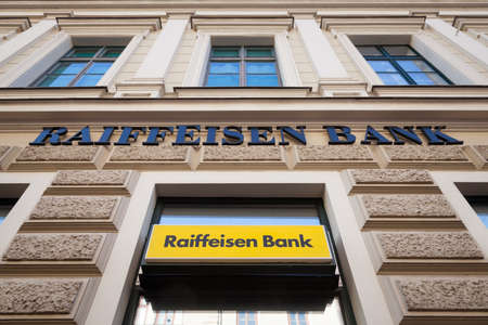 SZEGED, HUNGARY, JULY 3, 2018: Raiffeisen logo on their main bank in the center of Szeged. Raiffeisen is an Austrian bank, massively investing in Central and Eastern Europe