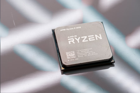 Gothenburg, Sweden - February 04 2023: AMD Ryzen 5 CPU processor on grey background