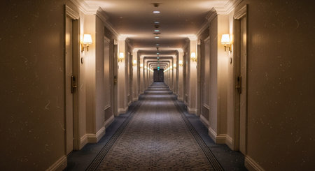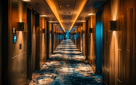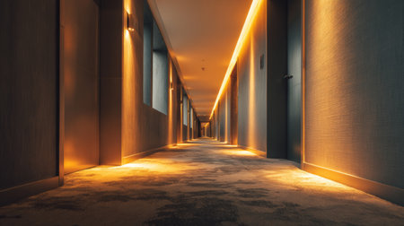 This captivating hotel corridor features soft ambient lighting and a minimalistic design, creating a tranquil atmosphere for guests.