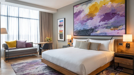 Explore a modern hotel room featuring a comfortable bed, vibrant artwork, and ample natural light, perfect for relaxation and a stylish urban getaway.