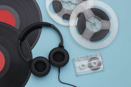 Retro vinyl records, audio magnetic reel, audio cassette and stereo headphones on a blue background. top view. flat lay