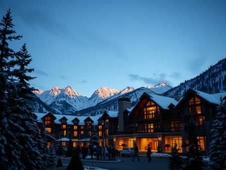 Alpine hotel in the Swiss Alps at night. Ski resort in winter.