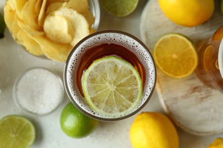 Glass of beer with lime slice, close up and top view