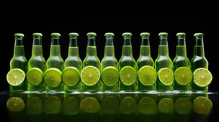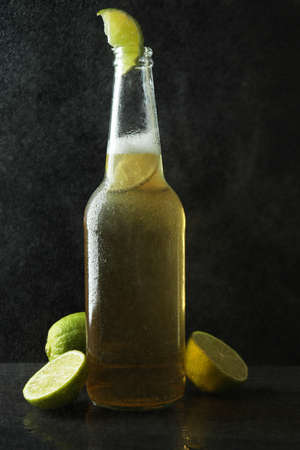 Wet bottle of beer with lime against dark background