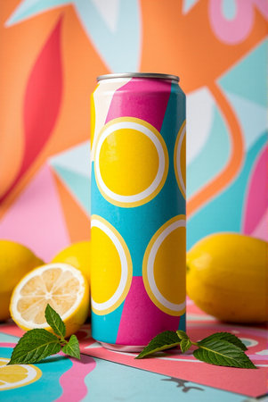 A concept of modern refreshment featuring a cold aluminum can with water droplets, surrounded by fresh sliced lemons on a geometric, abstract background