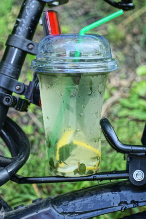 blue drink mojito lemonade with yellow lemon slices and mint leaves in a closed plastic glass with a straw stands on a black metal bike rack on the street