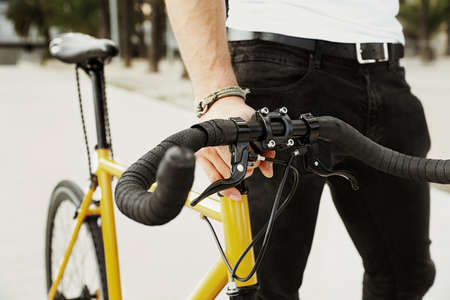 Close-up hipster on bike in the city. Horizontal shot without face. High quality photo.