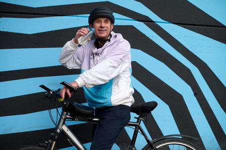 A man on a bicycle pauses to drink water in front of a bold blue and black geometric mural. A vibrant, active urban scene capturing modern lifestyle, movement, and street culture.