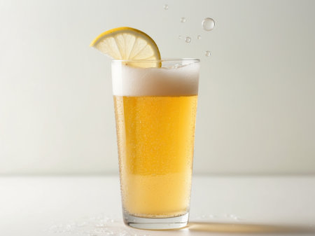AI Generated. Refreshing lemon slice on a frosty beer glass with bubbles