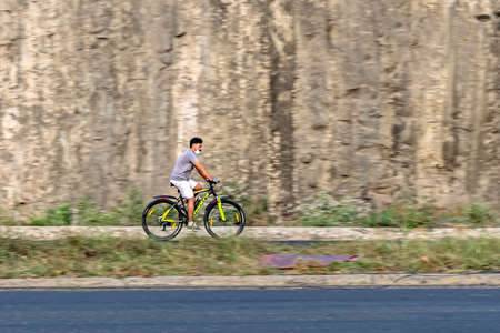 Pune, Maharashtra, India - January 1st, 2022 : Intentional camera movement, Motion blur, panning image of a bicycle rider on a way for fitness.