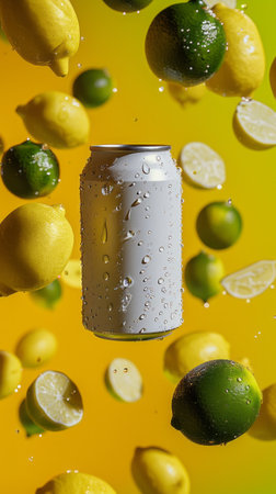 Soda drink can 330ml floating, lemons and limes in the air scattered, vibrant background of yellow and lime green color, tropical vibes.