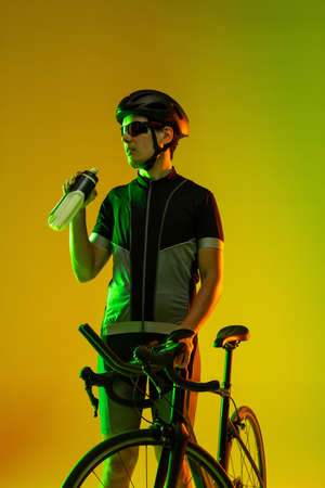 Cyclist riding a bicycle isolated against neon background