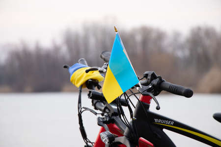 Ukraine Dnepr 29.03.2022 - Yellow-blue flag of Ukraine on a bicycle in a city in Ukraine, a protest action, stop the war in Ukraine, a patriot of his country