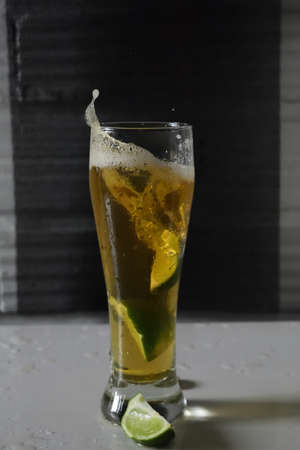 A vertical shot of a drop of lime with a splash of cold beer