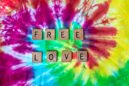 Toronto, Ontario, Canada — 'Free love' spelled out in wooden letters on multicolored swirl pattern tie-dye fabric, for Valentine's Day 2021.
