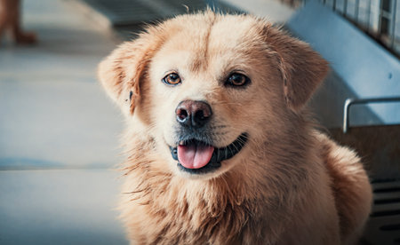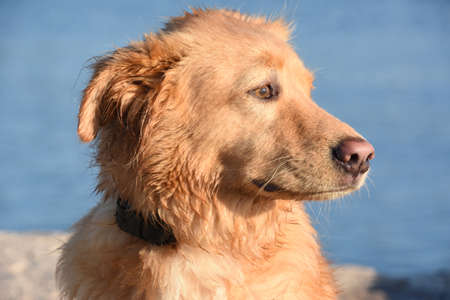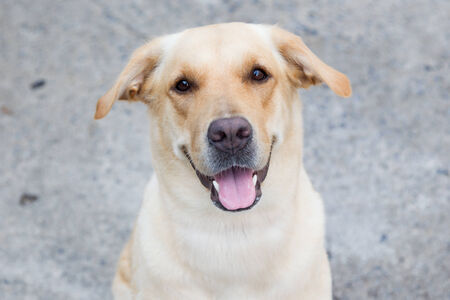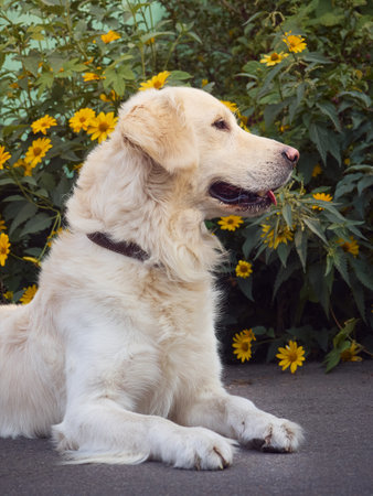 Pet cute young large breed golden retriever, one year old female with light cream coat color.